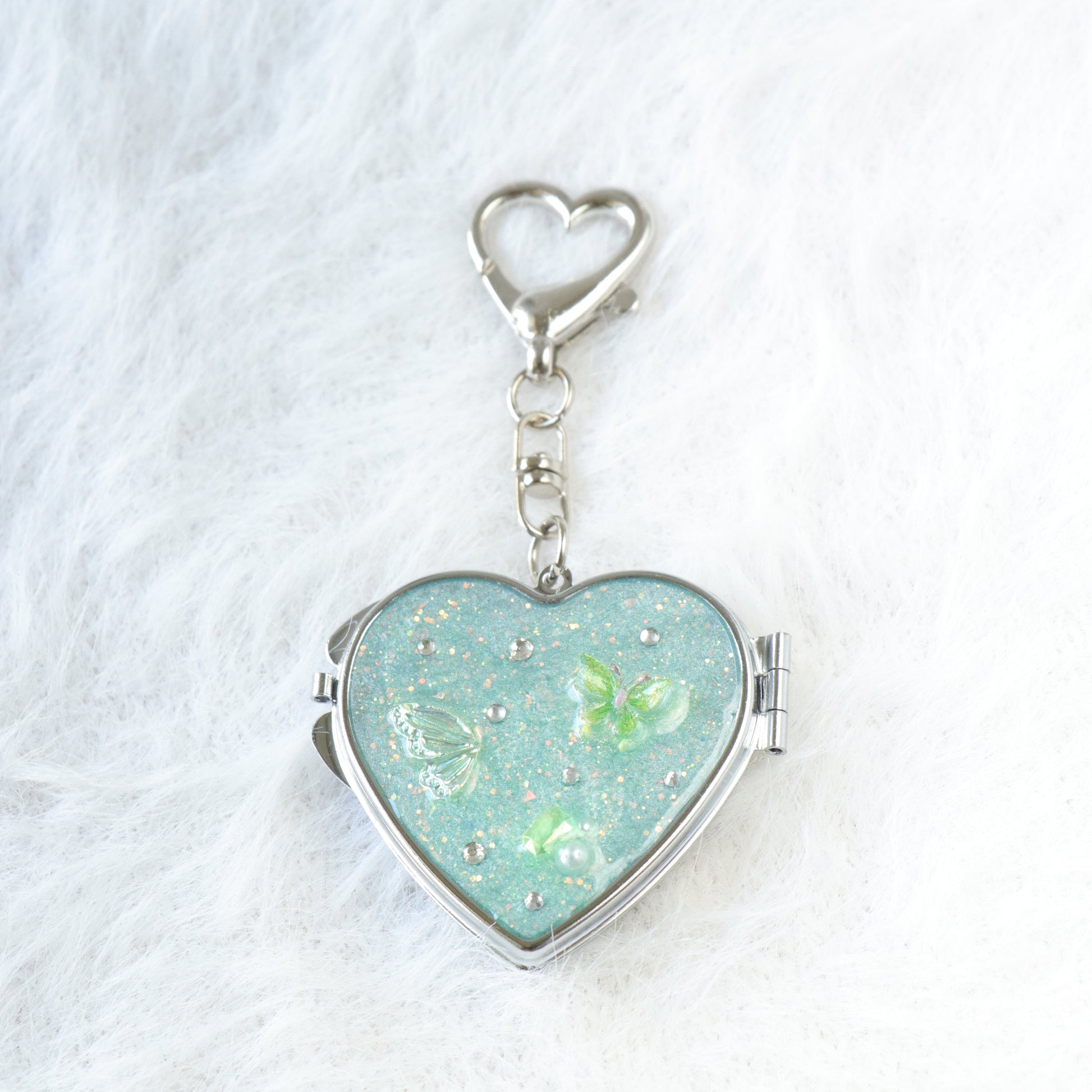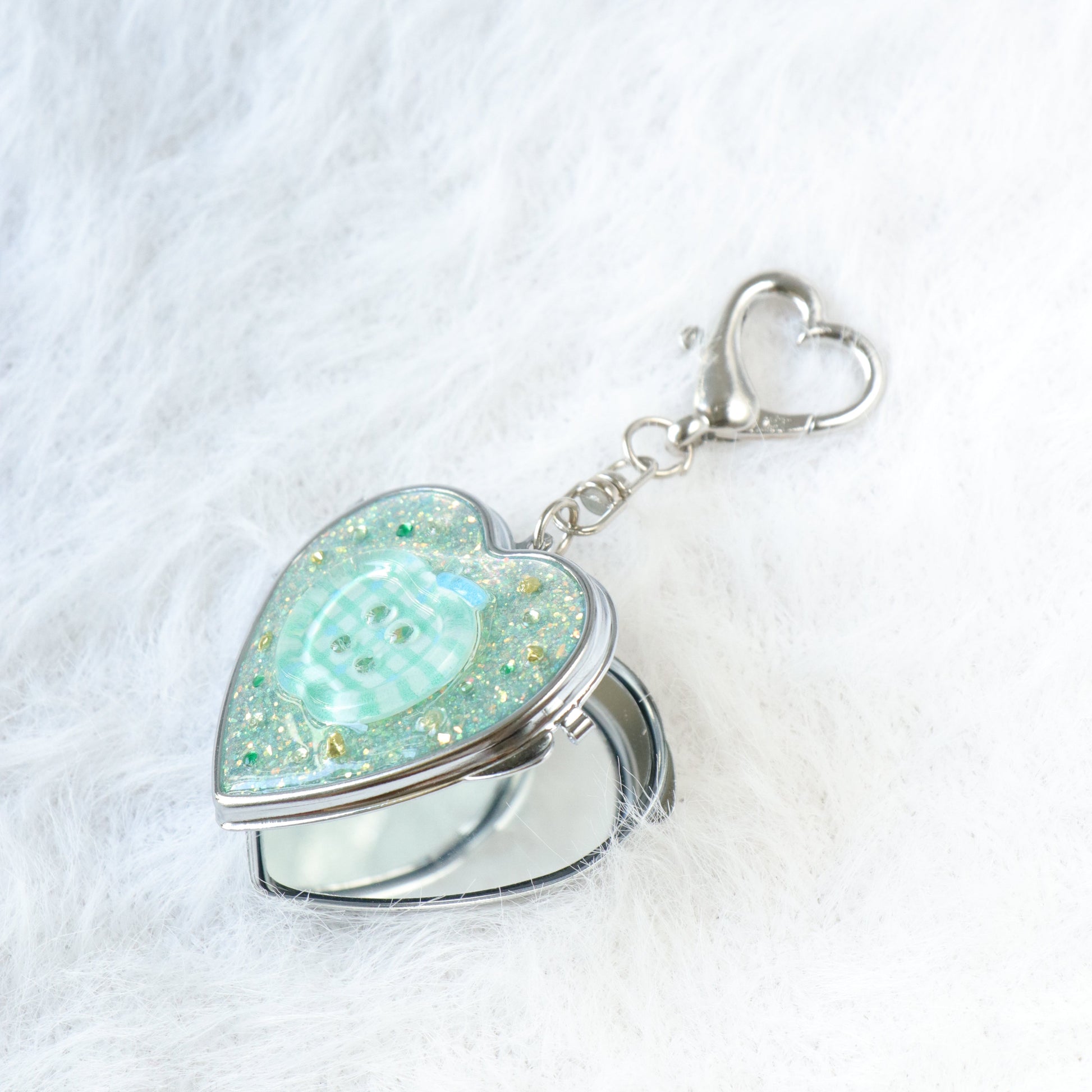 This adorable handmade resin heart keychain comes with a double-sided mini mirror hidden inside!